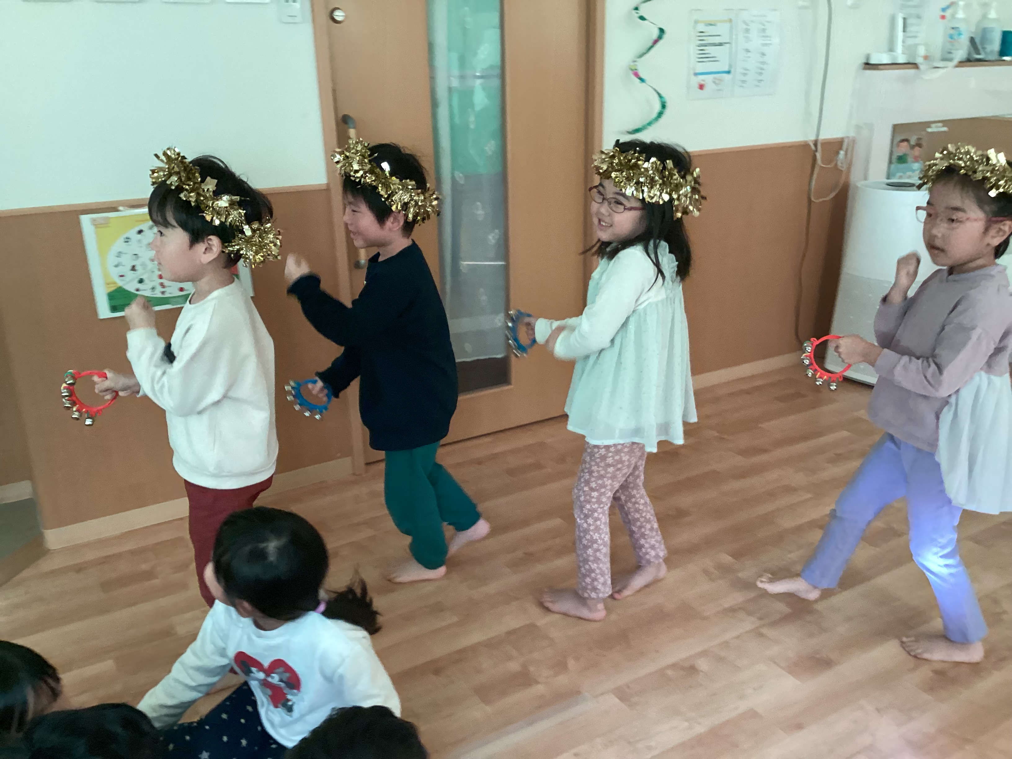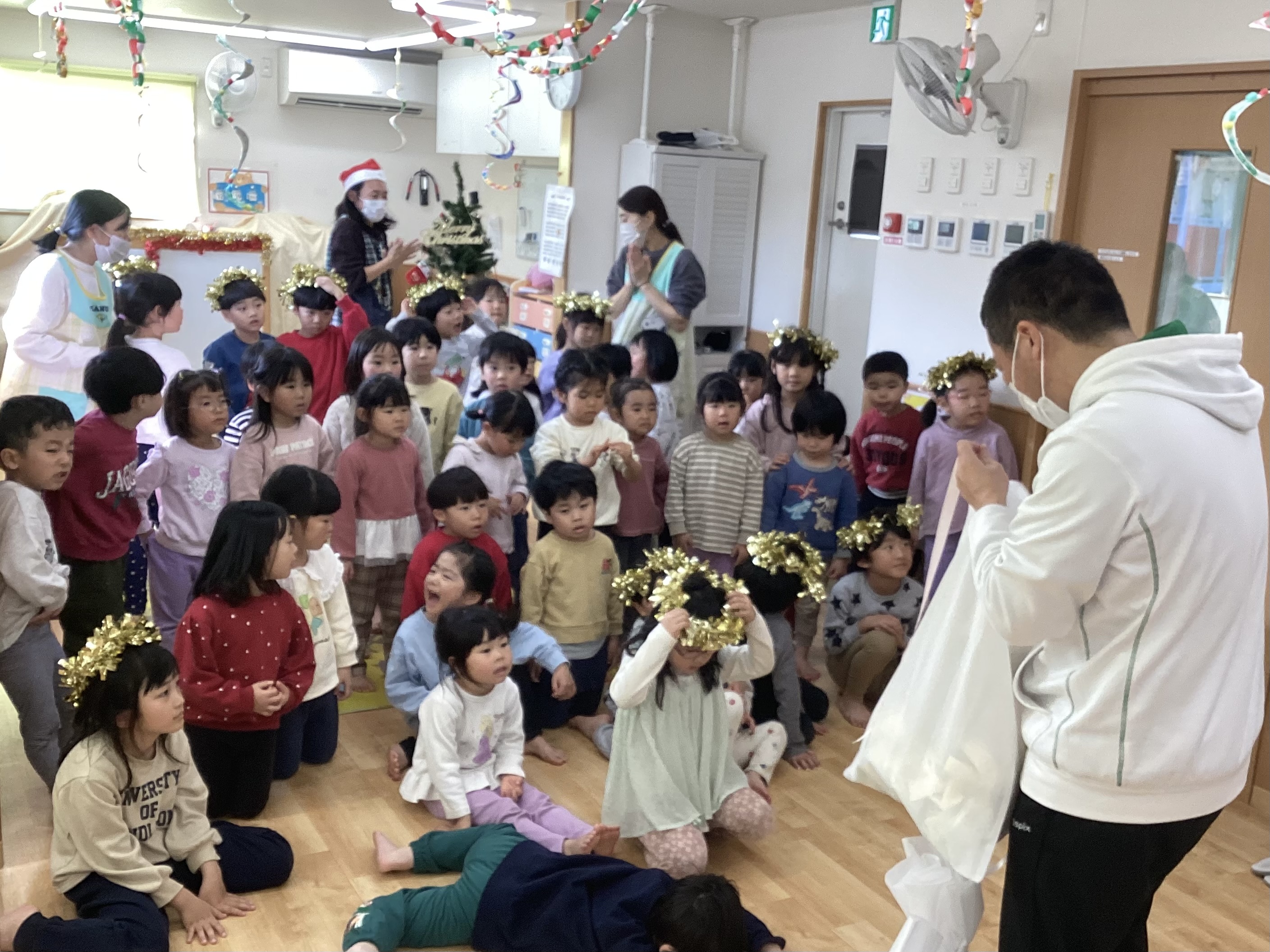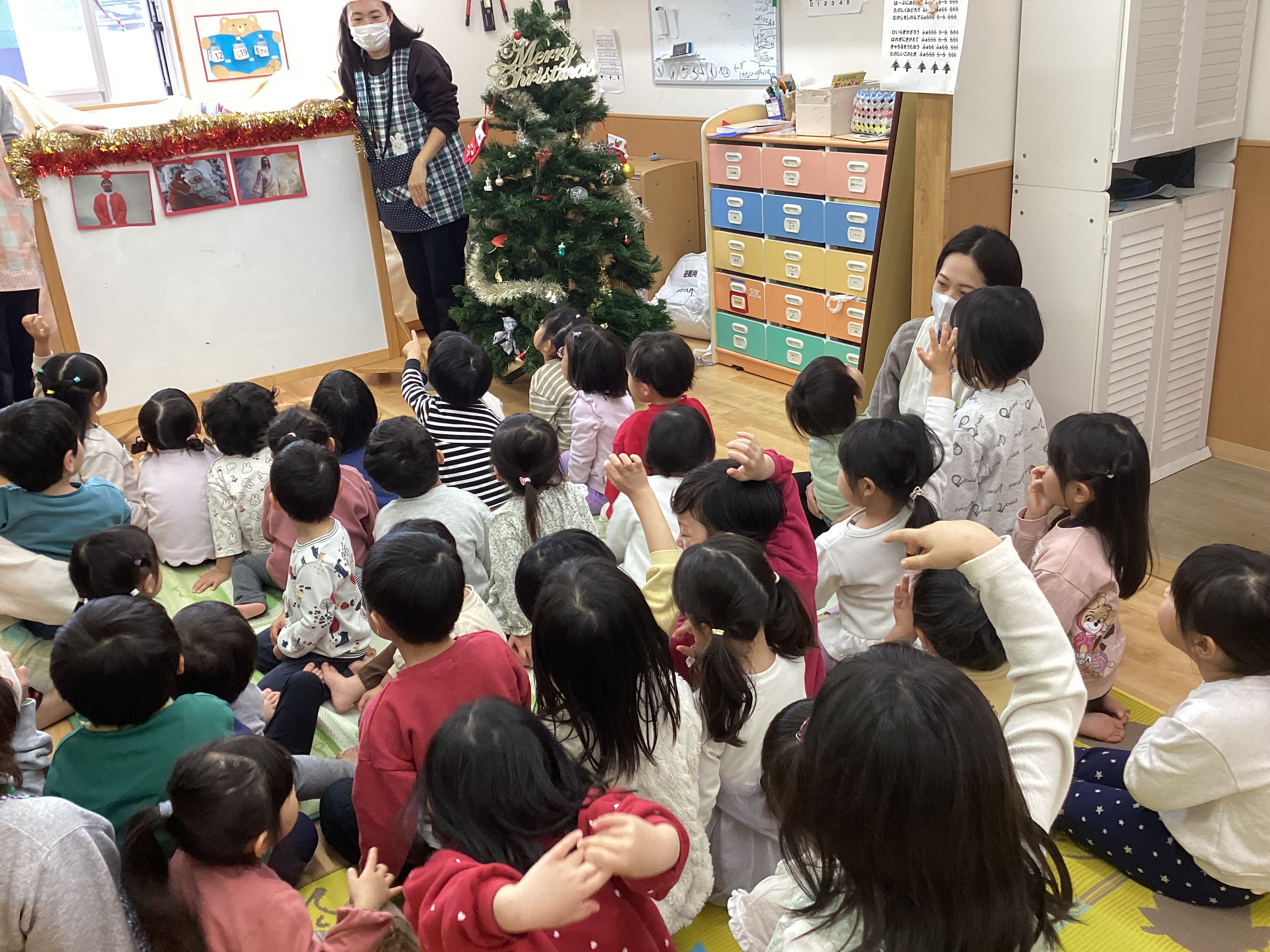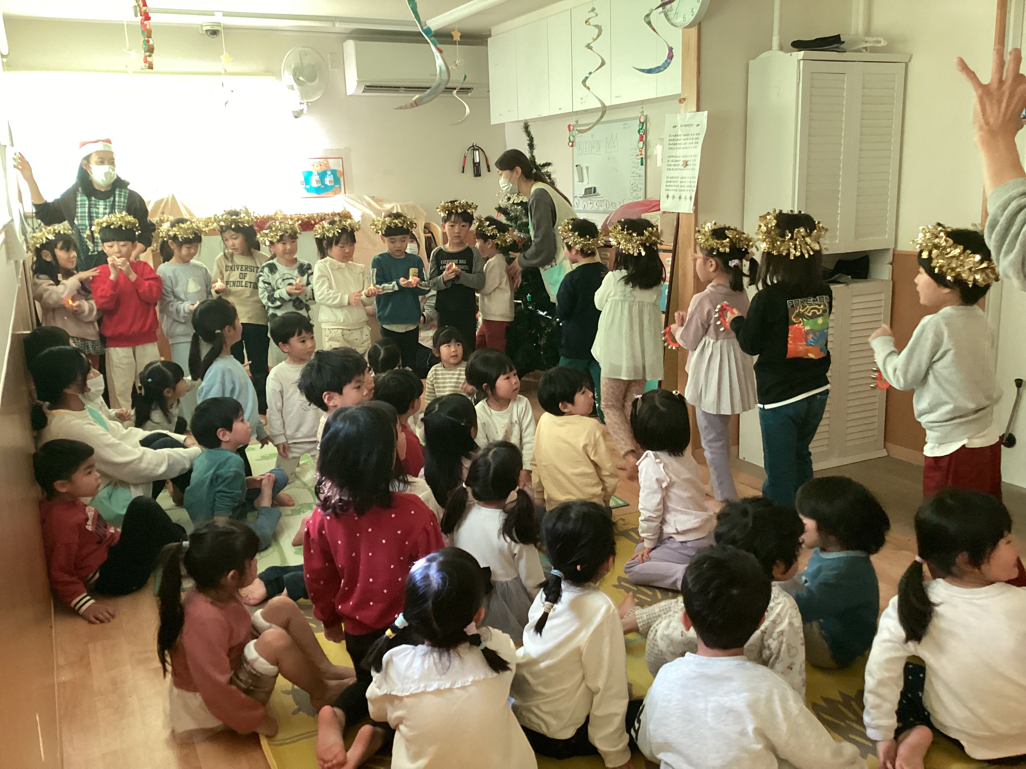 クリスマスにまつわるクイズを楽しんだ後は、みんなで「♪ひいらぎ飾ろう」を歌ったり、年長のつき組さん扮する天使が登場したりとクリスマスの雰囲気を味わいました。