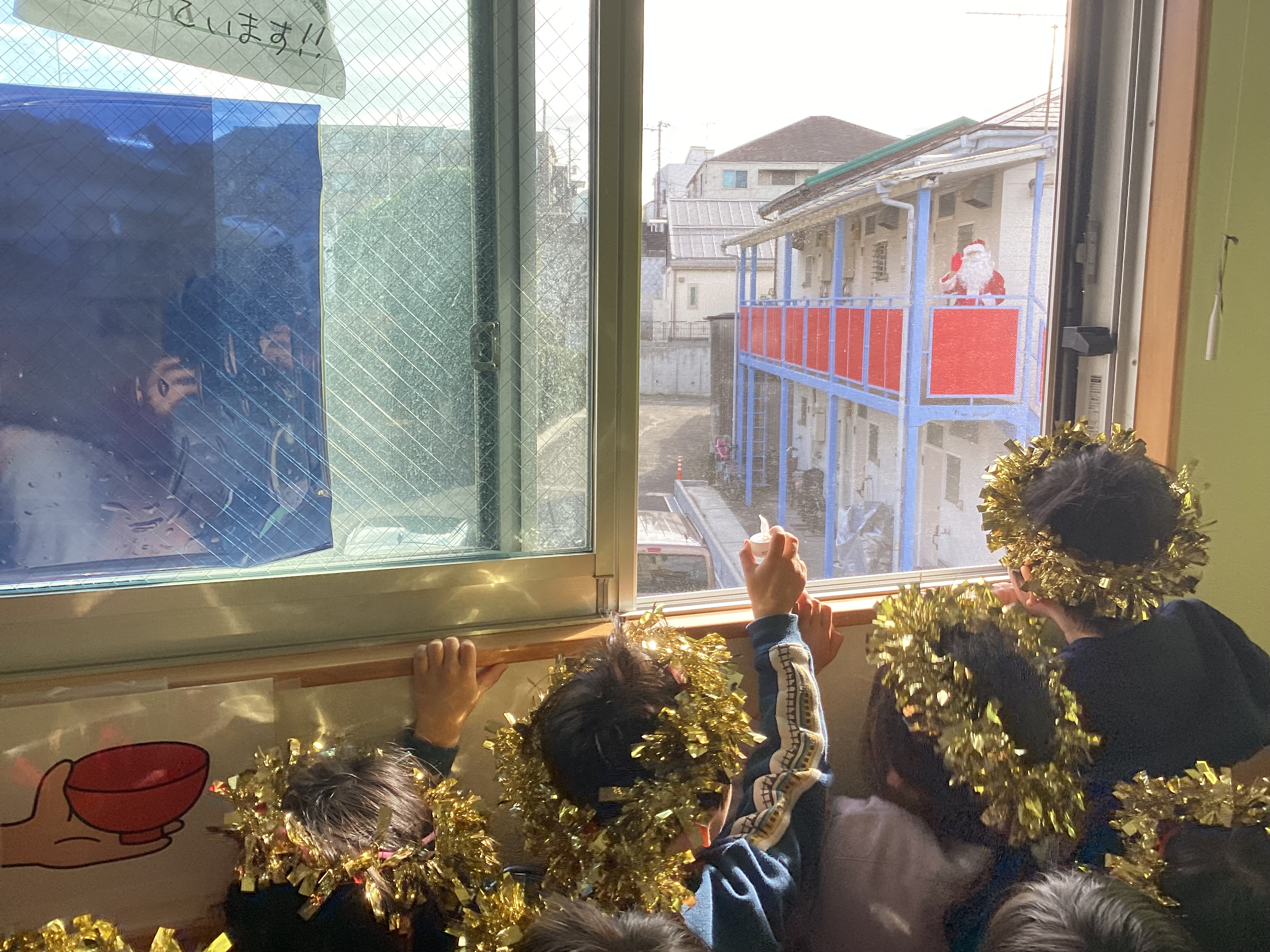 窓から外を見ると、なんとサンタクロースが手を振っていました!