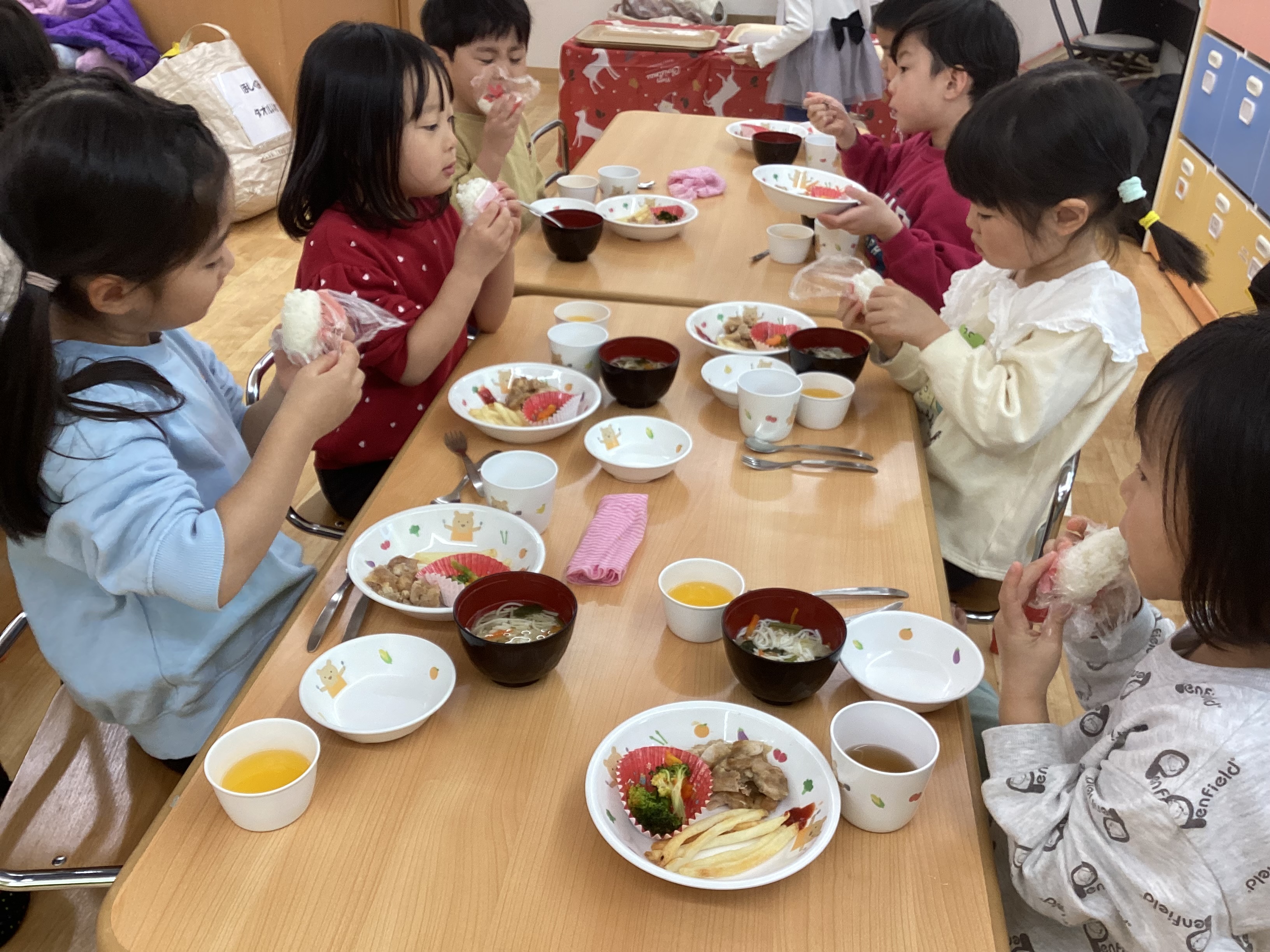プレゼントを貰い、お昼にはクリスマススペシャルメニューの給食も味わい、大満足の子どもたちでした。