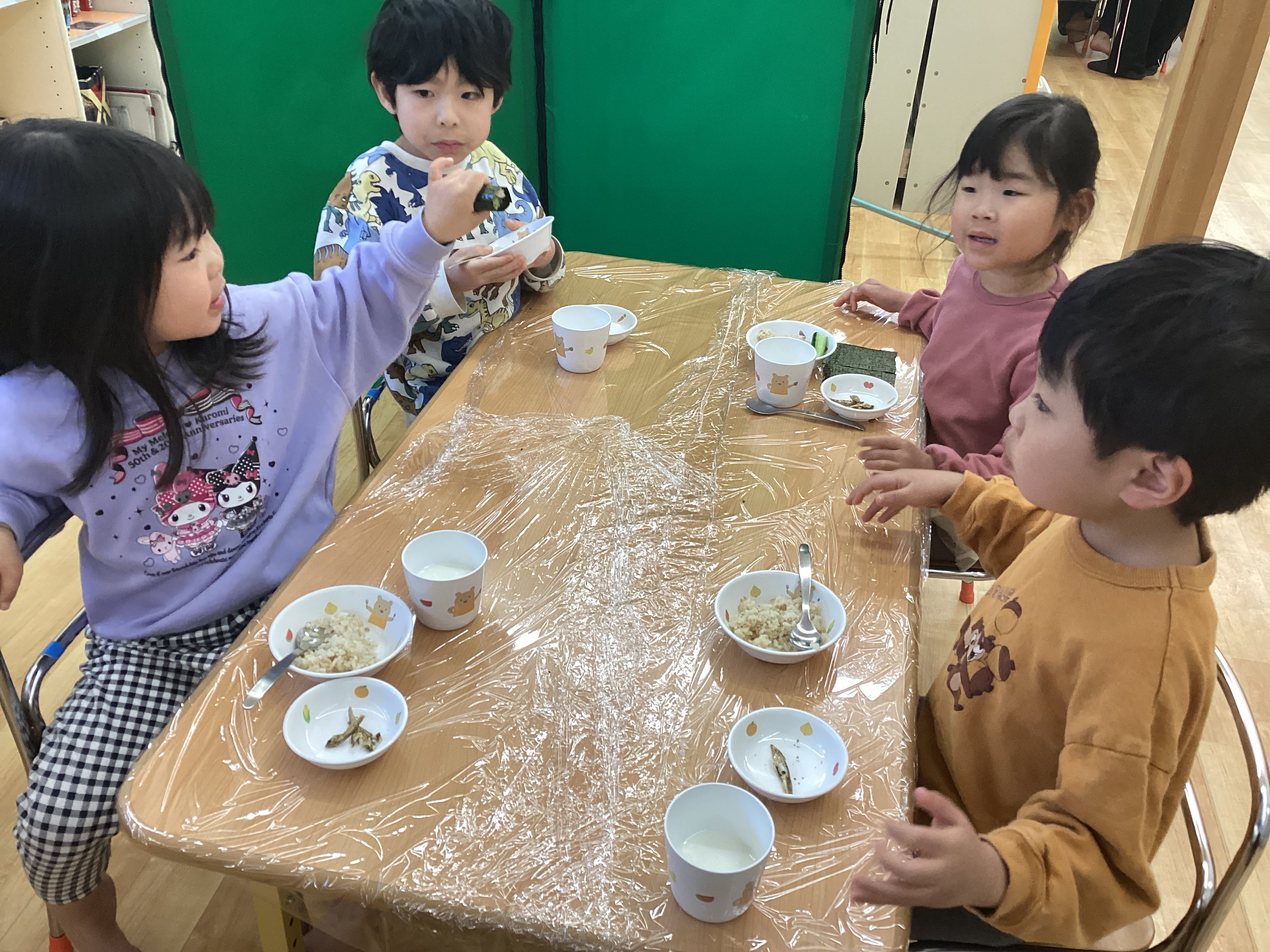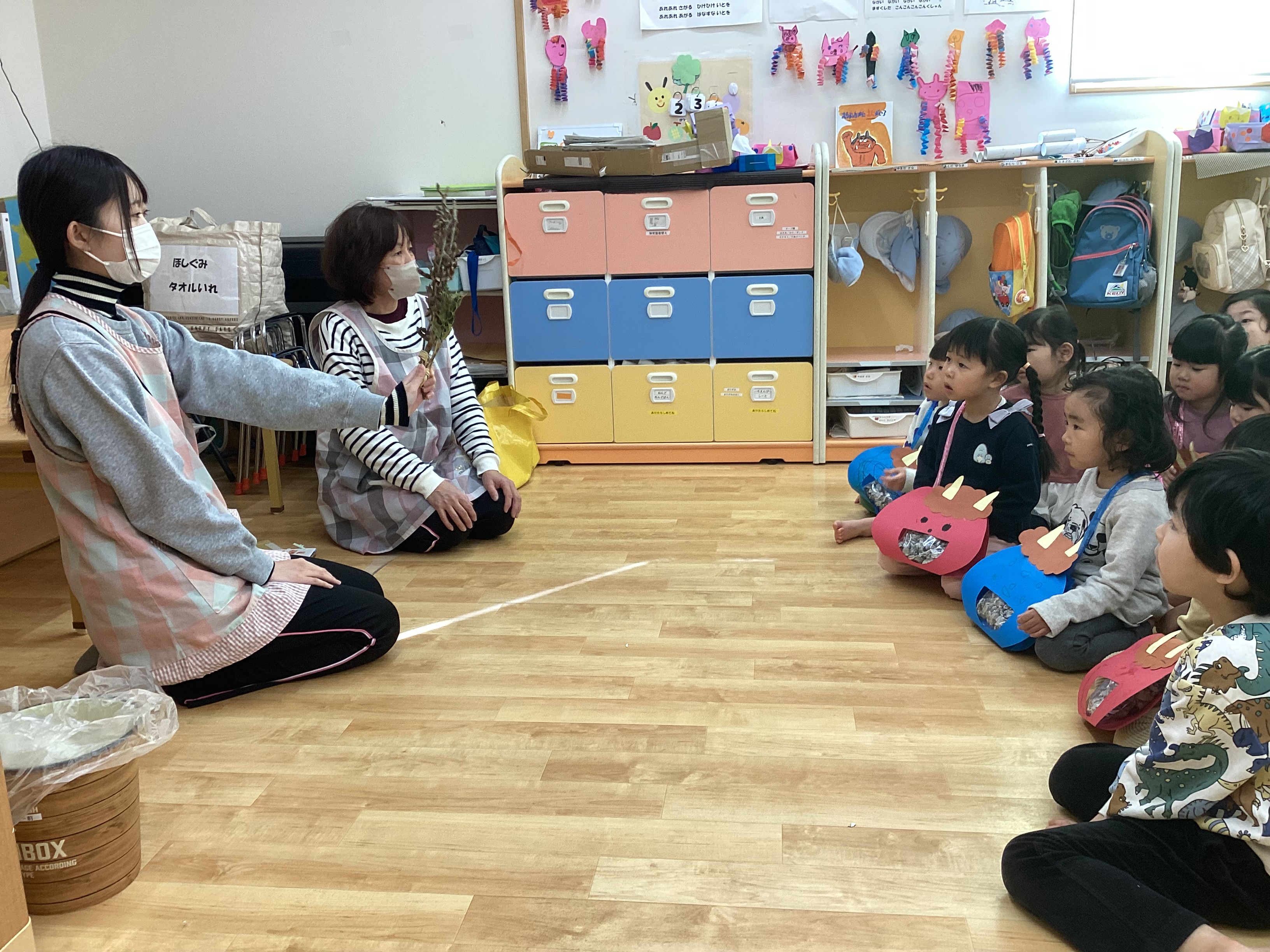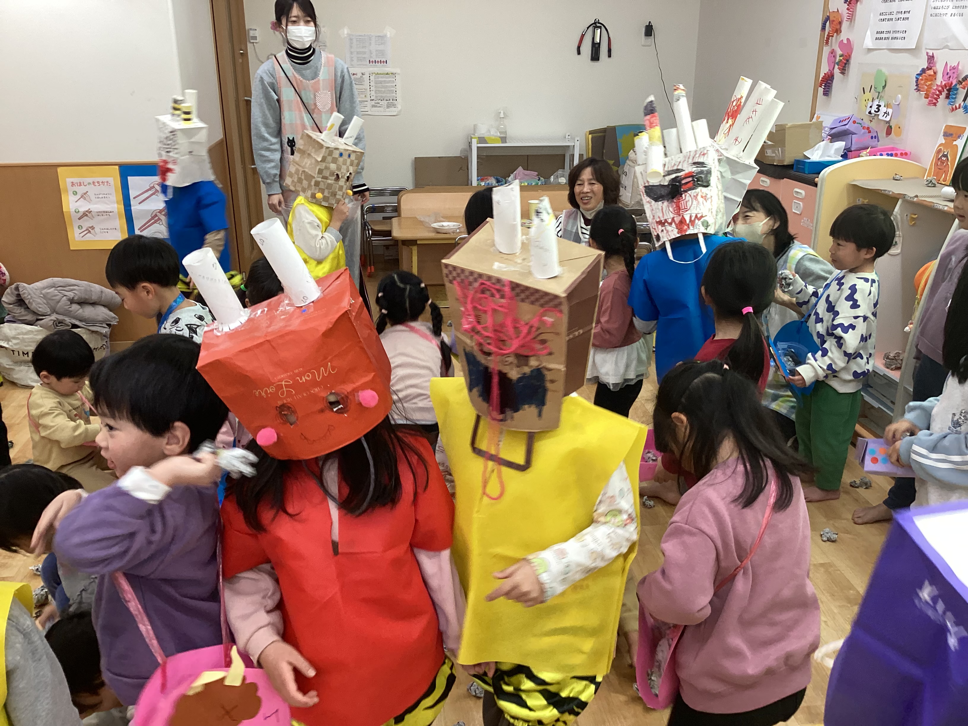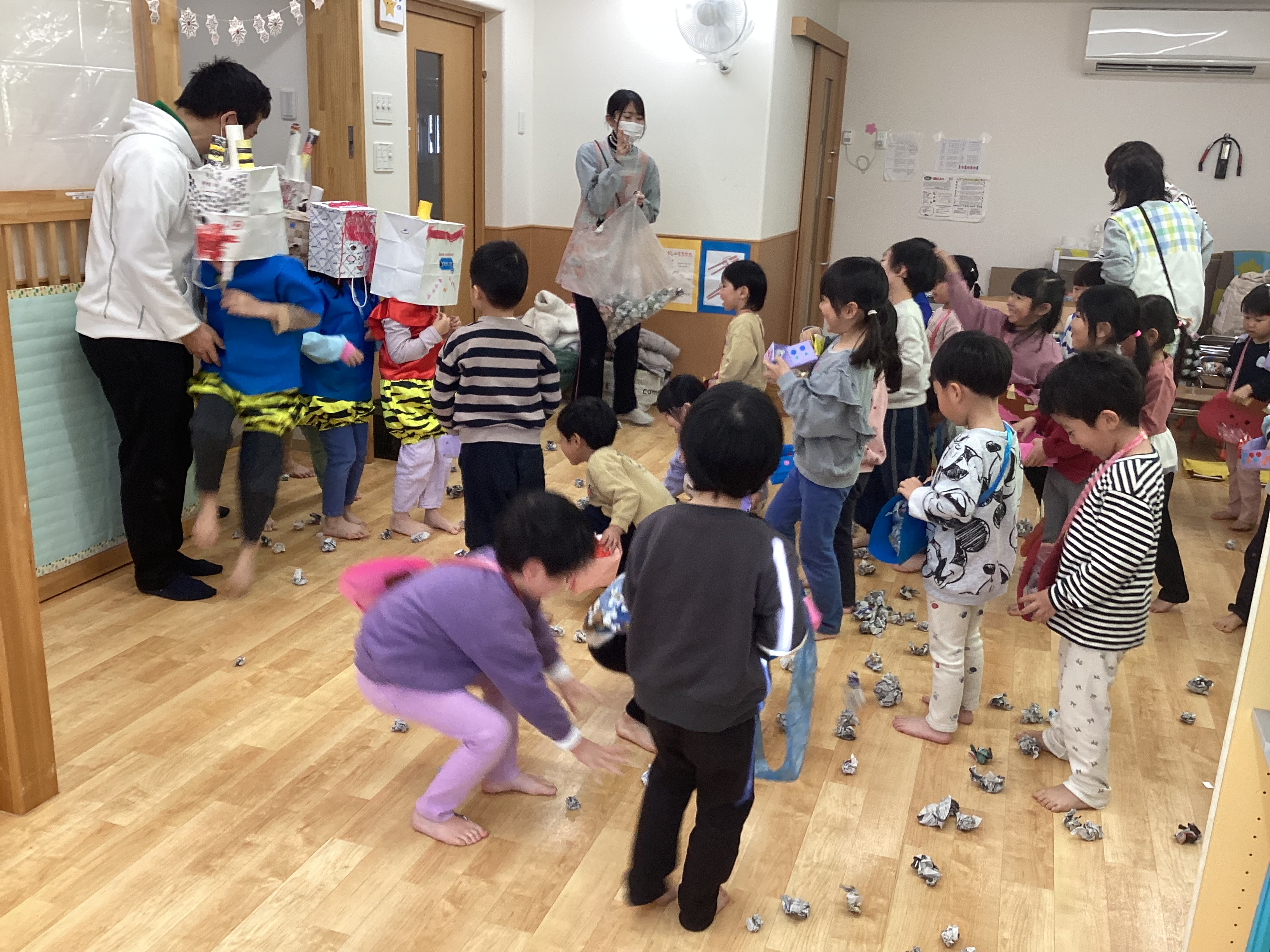 各クラス手作りの豆入れを持ち、新聞紙で作った豆で「鬼は外!福は内!」と豆まきを楽しみました。