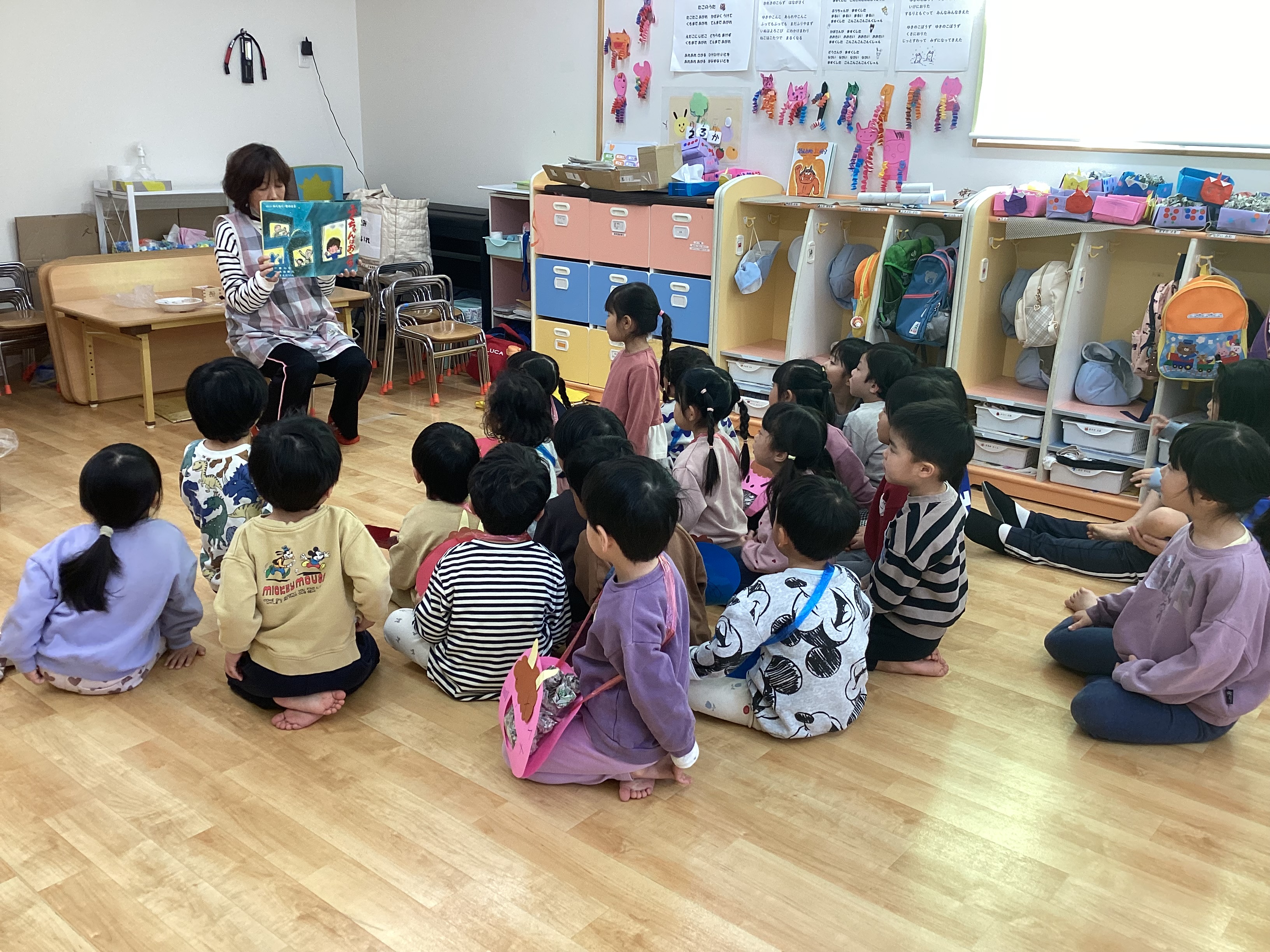 由来のお話や紙芝居を読んでいると、突然年長のつき組さんが扮する鬼たちが現れ、豆まき合戦がスタート!